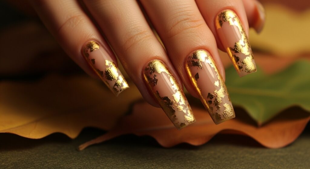 Gold foil accents add a glamorous yet refined touch to fall ballerina nails. When paired with nude or brown tones, the metallic shine creates a perfect balance of simplicity and luxury. This design works beautifully for fall weddings, parties, or festive gatherings. Subtle but eye-catching.