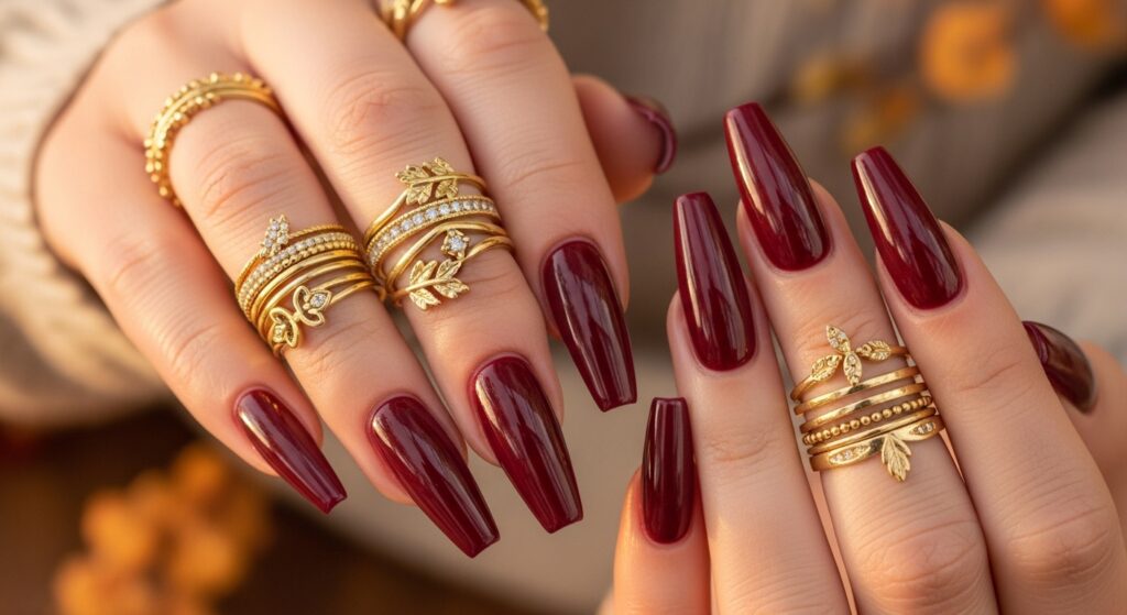 Burgundy ballerina nails create a rich, elegant fall look perfect for 2025. The deep wine shade pairs beautifully with gold jewelry and cozy autumn outfits. This design suits both long and medium ballerina shapes, offering a sophisticated vibe for special events or everyday wear. Add a glossy finish for maximum shine and seasonal glamour.