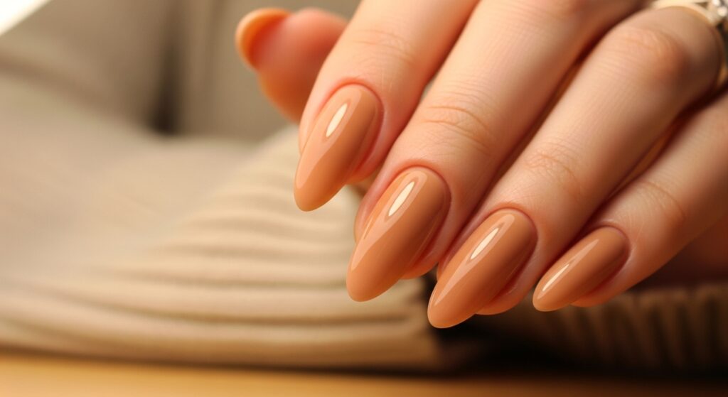 Caramel nude ballerina nails offer a soft, classy autumn style. The warm neutral tone blends seamlessly with fall wardrobes, making this look ideal for office wear or daily chic styling. The clean, elongated shape keeps the manicure elegant and modern. A glossy top coat enhances the natural, polished finish.