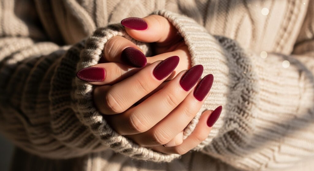 Velvet nails are a rising winter 2025–2026 trend, offering a soft, fabric-like texture that looks luxurious and cozy. On almond-shaped nails, the velvet finish gives a plush, winter-warm effect that catches light beautifully. This look pairs perfectly with festive outfits and cool-weather accessories, making it a standout seasonal choice for those wanting something unique and eye-catching.