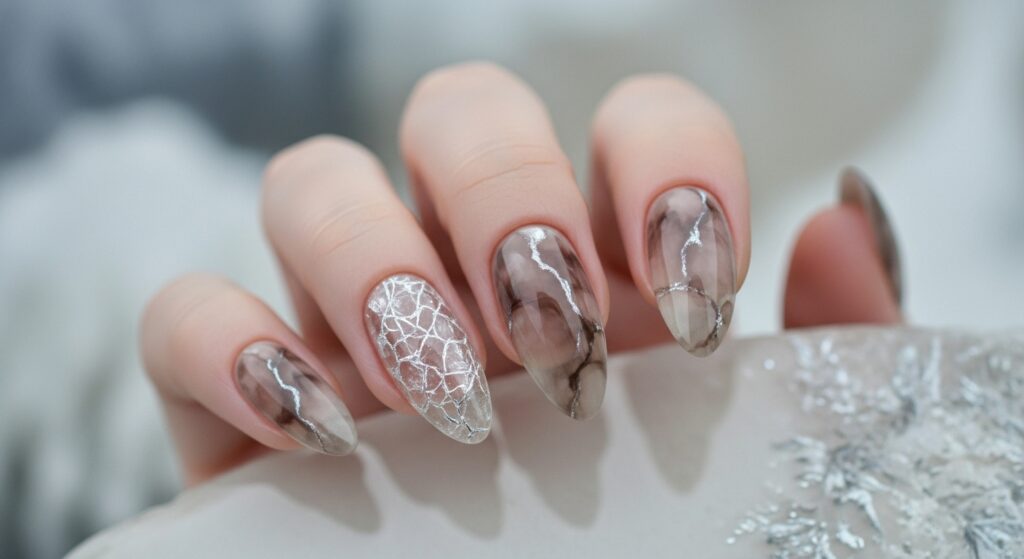 Ice-crystal nails mimic frozen patterns, creating a magical winter vibe. The almond shape makes the frosted detailing appear delicate and elegant. Using translucent layers, soft blue tones, and cracked-ice accents, this design feels fresh and seasonal. It’s perfect for holiday events, winter photo shoots, or anyone who wants a frosty, enchanted manicure.