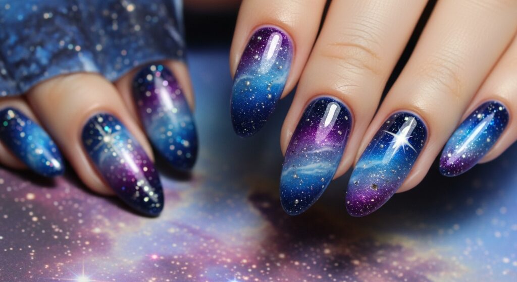 Midnight galaxy nails bring deep winter skies to your fingertips. Using shimmering blues, violets, and tiny star-like sparkles, this design feels mysterious and dramatic. The almond shape enhances the elongated galaxy effect. It’s great for winter nights, events, or anyone who wants a celestial-inspired nail trend for 2025–2026.