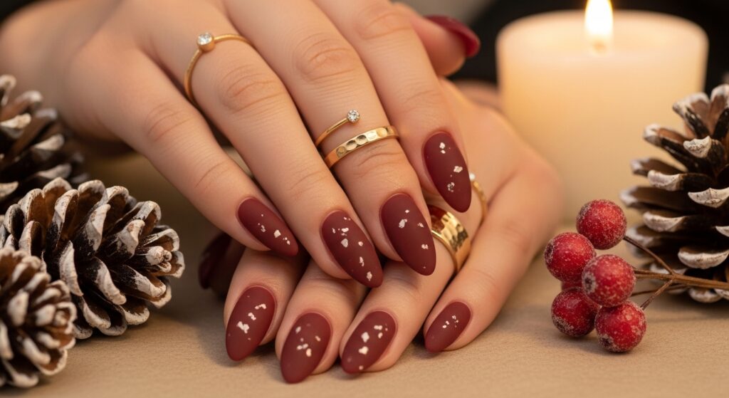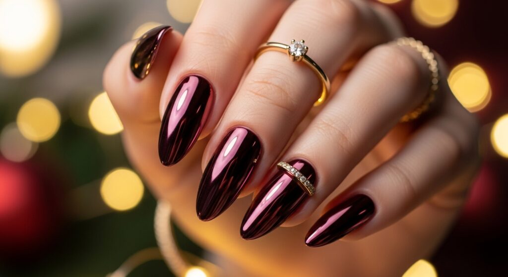 Metallic burgundy nails combine richness with shine, creating a dramatic winter look. The metallic finish glows beautifully under winter lighting, while the almond shape gives it a sleek, feminine touch. This trend is ideal for winter nights out, holiday parties, or anyone who loves bold, glamorous seasonal colors.