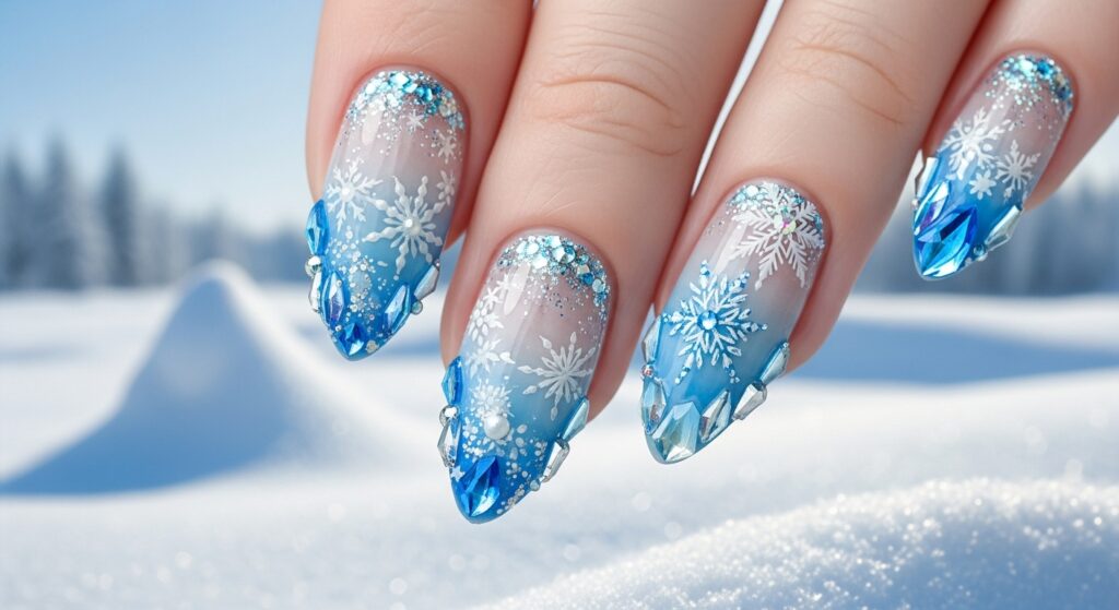 Frosty ombre nails blend soft whites, icy silvers, and pale blues for a smooth, dreamy winter gradient. On almond nails, the ombre effect elongates the shape and creates a frosty, delicate finish. This trend is ideal for winter brides, holiday parties, or anyone wanting a soft but show-stopping seasonal manicure.