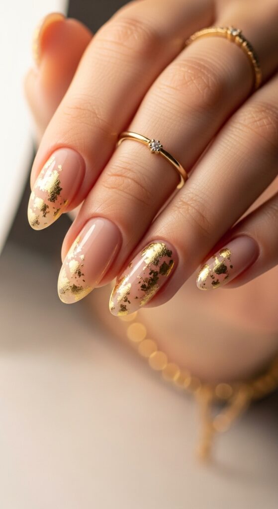 Gold foil nails bring sparkle and sophistication, making them ideal for special occasions in fall 2025. The oval shape softens the boldness of the foil, creating a balanced, glamorous look. Gold foils pair beautifully with nude, brown, and burgundy bases, allowing endless design versatility.