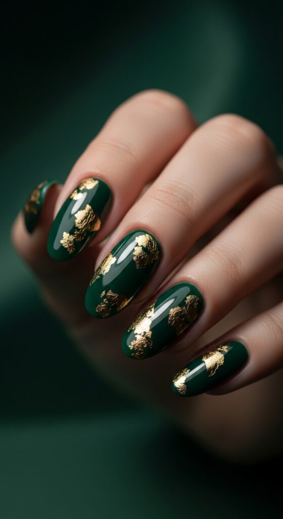 Forest green nails capture the deeper, richer tones of late autumn. On an oval shape, this color becomes bold yet sophisticated. It’s an excellent choice for evening wear or statement fall looks. Add glossy shine or gold foils for extra dimension. Forest green is a top trending shade for 2025’s colder months.
