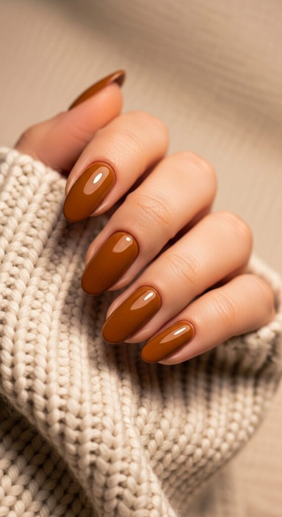 Cinnamon brown nails bring a cozy, spicy touch to your fall manicure. This warm brown shade complements oval nails perfectly with its soft, rounded elegance. Cinnamon brown works well with minimal nail art or monochrome styling, making it ideal for everyday fall outfits. It’s a comforting yet trendy shade for Autumn 2025.