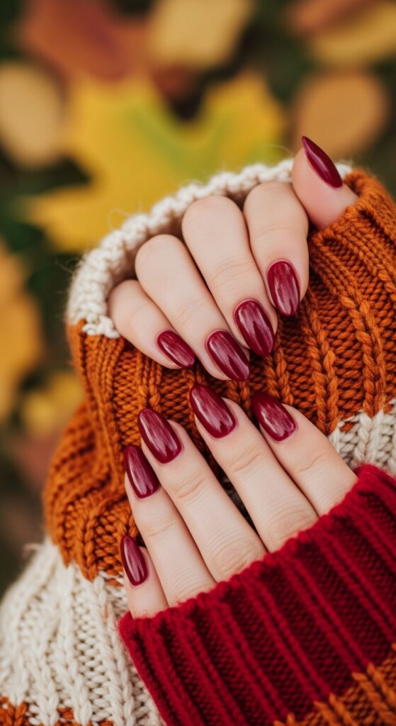 Burgundy oval nails are a timeless fall favorite for 2025. This rich, deep shade brings elegance to everyday styling and pairs beautifully with cozy outfits and gold accessories. The oval shape enhances the color’s sophistication while keeping the look soft and feminine. Perfect for work, casual outings, and fall evenings, burgundy nails remain a must-have seasonal staple.