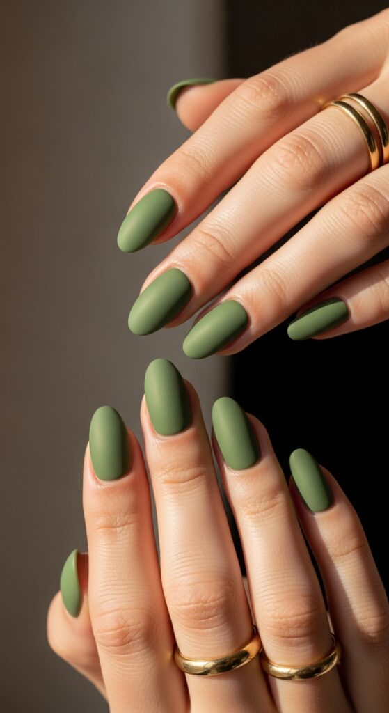 Matte olive nails offer the perfect earthy aesthetic for fall 2025. This muted green shade feels both modern and grounded, making it ideal for oval nail shapes. Olive pairs beautifully with simple line art, gold jewelry, or minimalist french tips. Its calm, natural tone makes it one of the season’s most versatile and stylish choices.