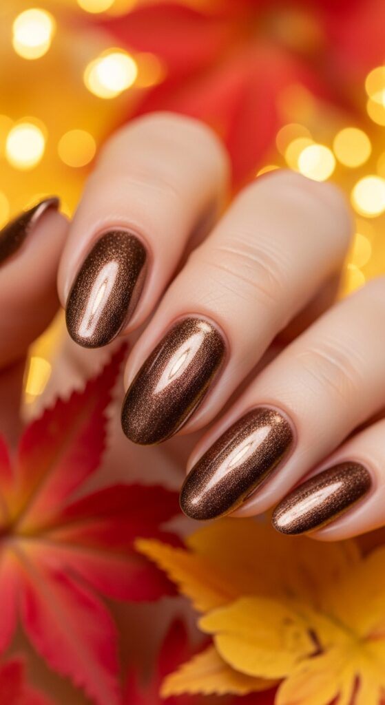 Bronze shimmer nails add warmth and glam to fall manicures. On oval nails, this metallic shade creates a soft, elegant glow that suits holiday gatherings and evening looks. Bronze is a top trend for 2025 thanks to its versatility and luxurious finish. Pair it with brown or nude tones for a chic autumn aesthetic.