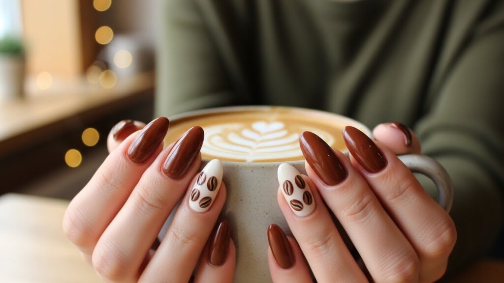 A soft brown manicure paired with one or two accent nails featuring tiny coffee bean or latte-art-inspired designs. Cute, fun, and very on-theme for autumn.