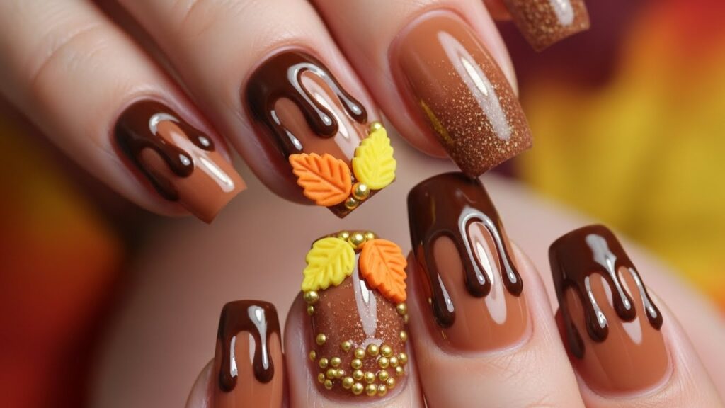 Glossy chocolate-brown nails with playful drip art add a fun dessert-inspired twist to fall manicures. They look especially cute on short nails.