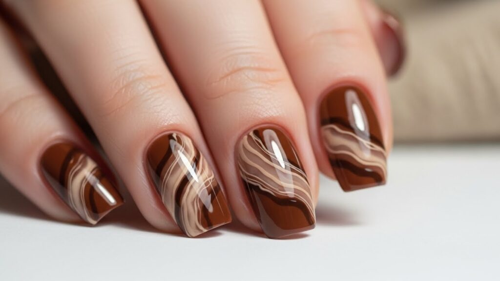 Soft caramel, beige, and brown swirls create a creamy marble effect that feels warm and luxurious for autumn. The fluid patterns give each nail a unique artistic touch, perfect for cozy fall outfits.