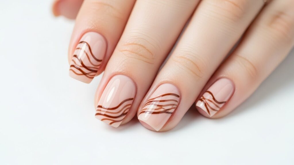 A beige base with soft brown wavy lines creates a modern abstract look. It’s minimal but artistic — ideal for trending 2025 nail aesthetics.