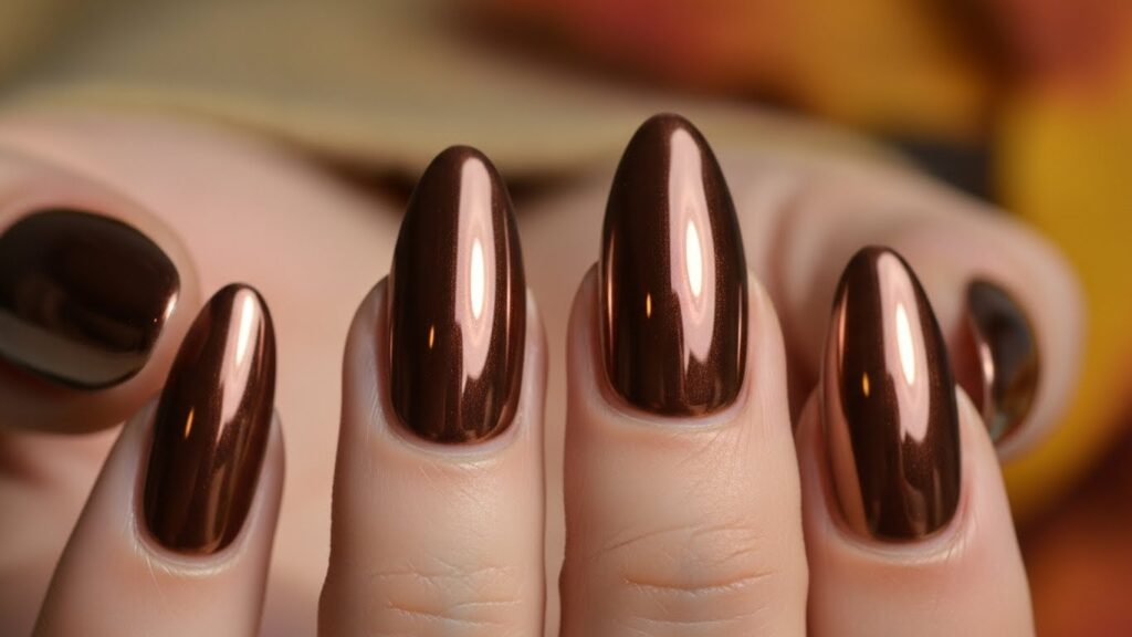 Mocha-brown chrome nails give a soft metallic sheen that looks modern and stylish. The reflective finish pairs beautifully with fall sweaters and neutral tones.