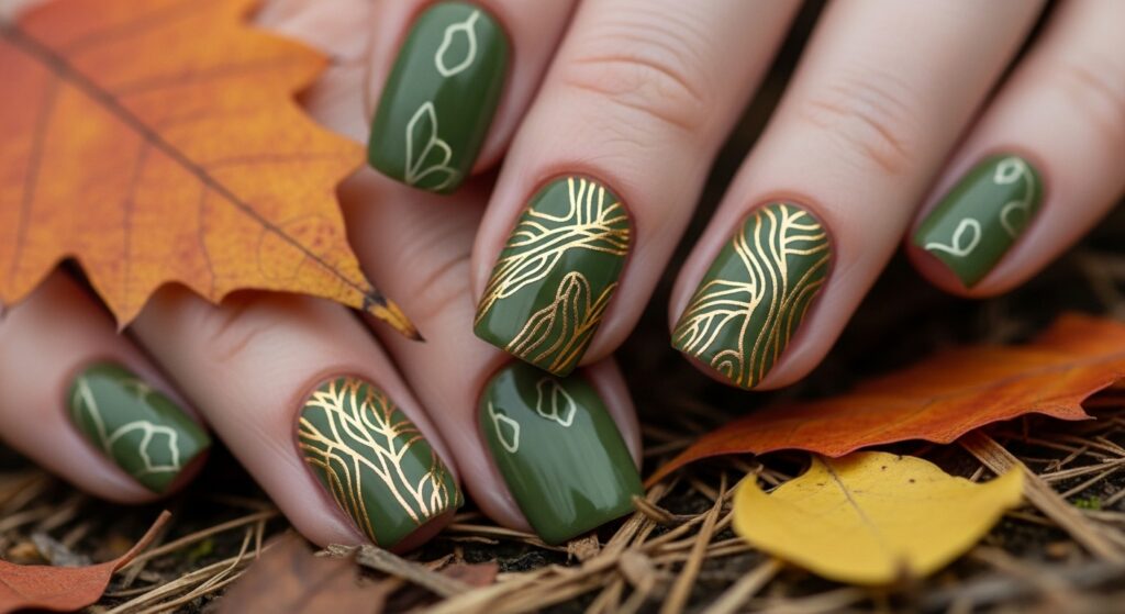 Olive green nails are trending for 2025 thanks to their earthy, modern vibe. This muted green shade suits minimalists who still want a seasonal touch. Add thin gold lines or white accents for a chic upgrade. It’s a clean, nature-inspired look perfect for autumn.