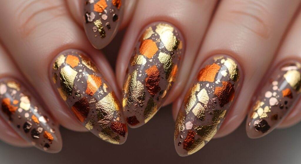Gold leaf nails bring glam and elegance to fall 2025 trends. This design pairs beautifully with nude, brown, or burgundy bases. The metallic flakes catch the light and create a luxurious, festive vibe—perfect for parties, dinners, or seasonal events.