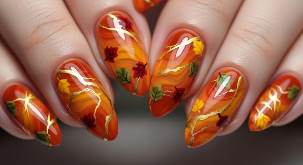Burnt orange marble nails add a stunning seasonal flair with swirling orange, caramel, and gold tones. This design is artistic and eye-catching, perfect for fall photoshoots or festive events. The marble effect gives your nails a luxurious autumn vibe.
