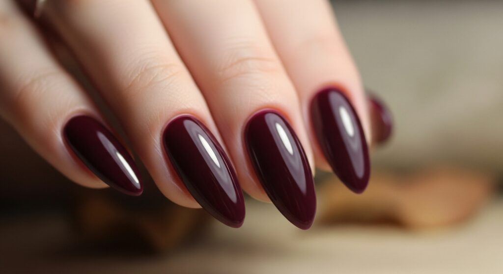 Burgundy wine nails remain a timeless classic for fall, and 2025 is no exception. This deep, rich color feels luxurious, especially with a glossy or velvet-matte finish. It pairs well with gold jewelry and warm outfits, making it a go-to choice for evening and everyday wear.