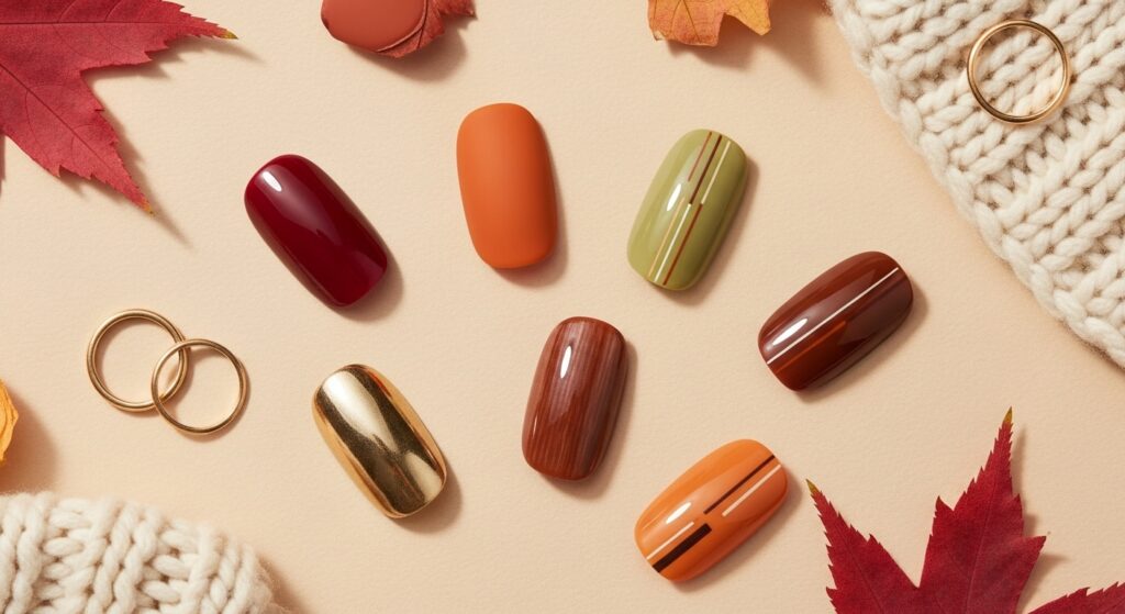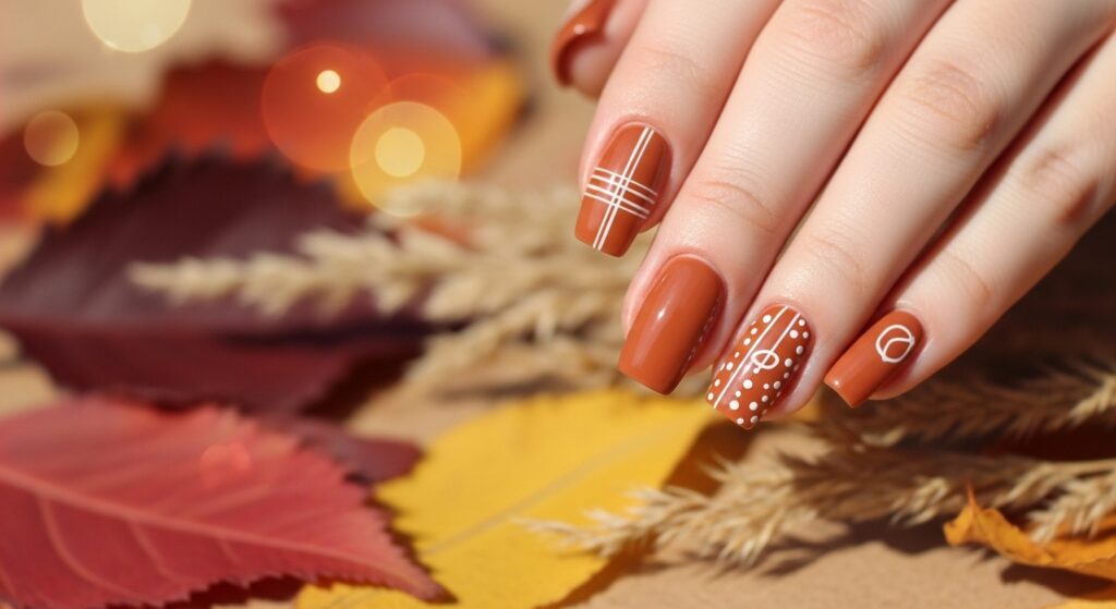 Terracotta nails offer a warm, clay-inspired shade ideal for autumn. This earthy color pairs well with clean white patterns or simple geometric accents. Terracotta provides a natural yet stylish look that suits all nail shapes and lengths.