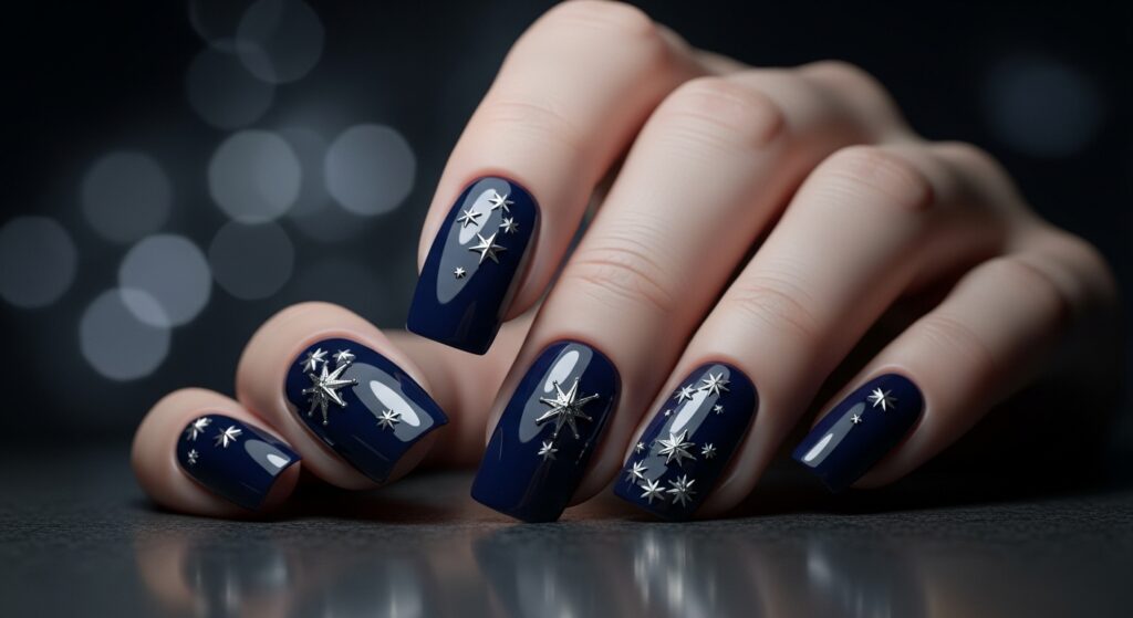 Navy blue nails add bold elegance to fall 2025 manicures. This deep shade gives a chic, modern edge and pairs beautifully with silver accents or celestial designs. Glossy navy creates a sleek nighttime vibe perfect for autumn evenings.