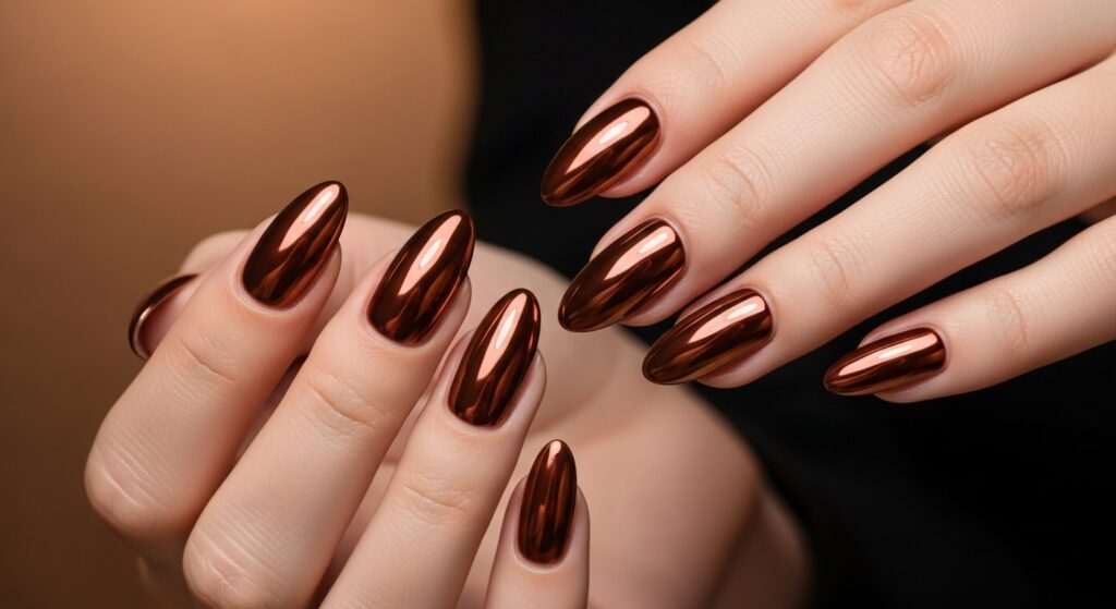 Brown chrome nails bring a molten-metal effect that’s trending strong in fall 2025. This shiny, reflective finish turns a simple manicure into a high-fashion statement. Perfect for parties, styling shoots, or a bold everyday look.
