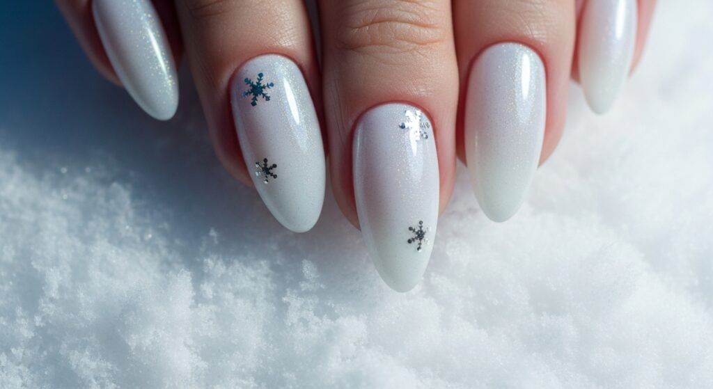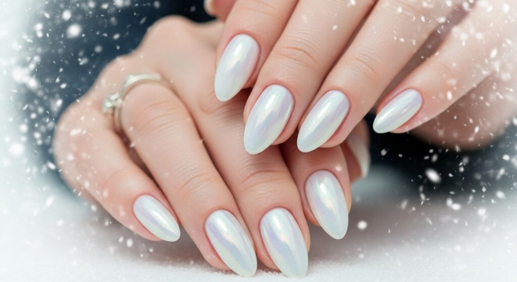 White pearl gel nails create a soft, elegant winter manicure with a luminous finish. The pearlescent glow adds dimension without being too bold, making it great for winter weddings and holiday events. The gel formula enhances the shine and smoothness, keeping the look flawless for weeks.