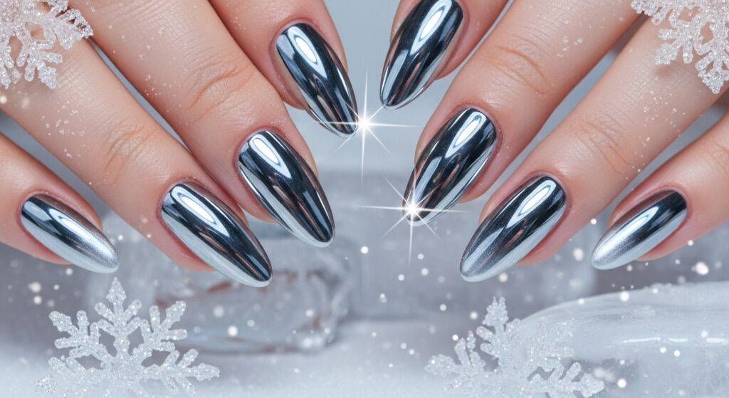 Silver chrome nails offer a futuristic winter vibe. This reflective metallic finish is trending for 2025–2026 thanks to its bold, icy look. Gel chrome nails stay shiny and smooth for weeks, and they pair well with black, navy, and white outfits. They’re perfect for winter parties and night events.