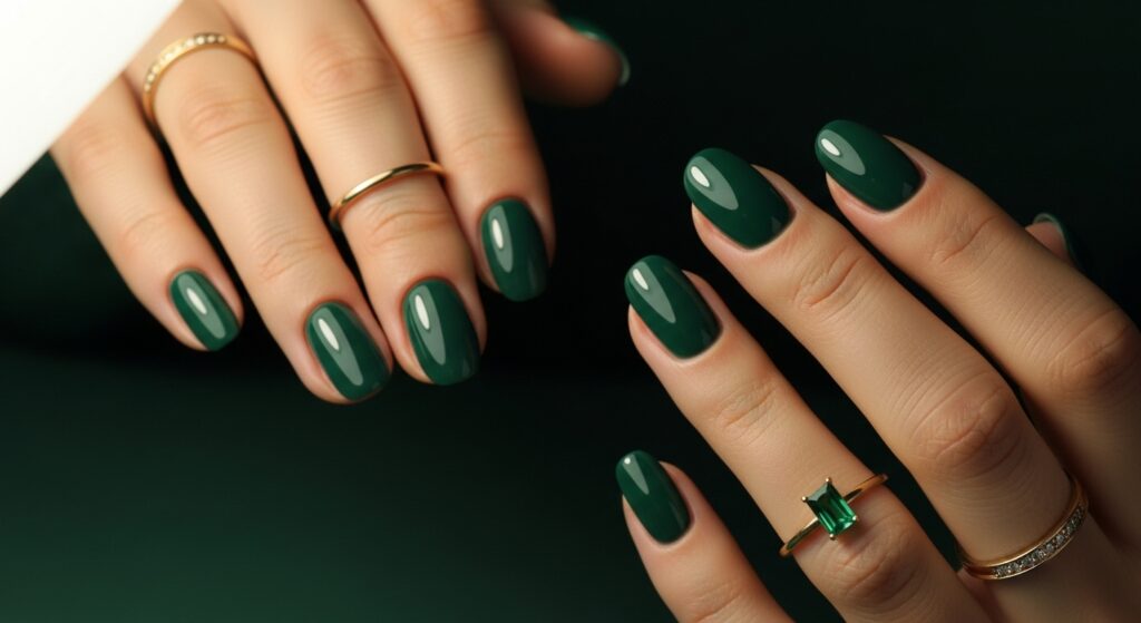 Emerald green gel nails provide a rich, jewel-toned winter look. The glossy gel layer enhances the deep green color, making it perfect for Christmas and winter celebrations. Emerald nails add elegance and depth to any outfit, especially when paired with gold foil or metallic accents.