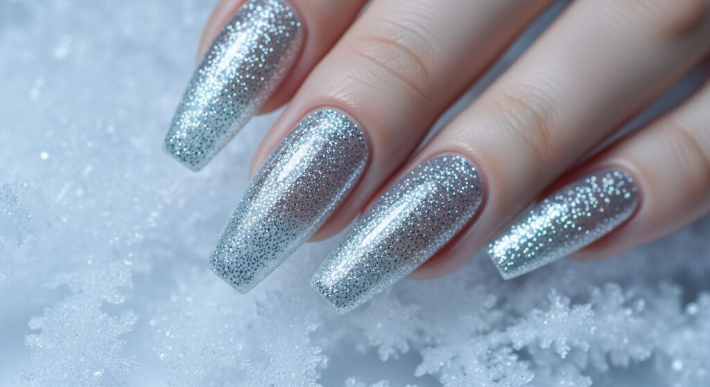 Silver glitter gel nails bring instant festive sparkle to your winter manicure. This shimmering look is perfect for New Year celebrations, night events, and winter weddings. The gel finish keeps the design smooth, durable, and glossy for weeks. Silver glitter pairs beautifully with white, blue, or nude tones, making it a versatile winter favorite.