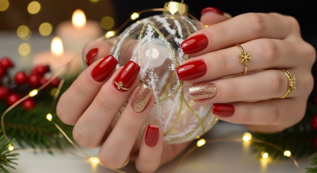 Ruby red gel nails are a festive classic for winter 2025–2026. This deep, glossy red offers a glamorous holiday look that never goes out of style. The gel finish intensifies the richness of the shade and keeps the color vibrant. Add glitter or gold accents for a true seasonal touch.