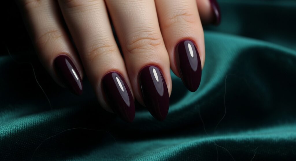 Deep plum gel nails offer a dramatic and luxurious winter look. This rich purple shade feels bold yet sophisticated, making it perfect for evening outings and special occasions. The gel finish enhances the depth of the color, giving it a smooth, glass-like shine. It’s a standout shade for women who love dark winter manicures.