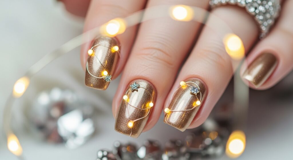 Champagne gold gel nails bring soft glamour to the winter season. This elegant metallic shade is perfect for holiday parties and festive events. Its neutral warm shimmer complements all nail lengths and shapes. The gel finish gives the manicure lasting brilliance, making champagne gold a top winter trend.