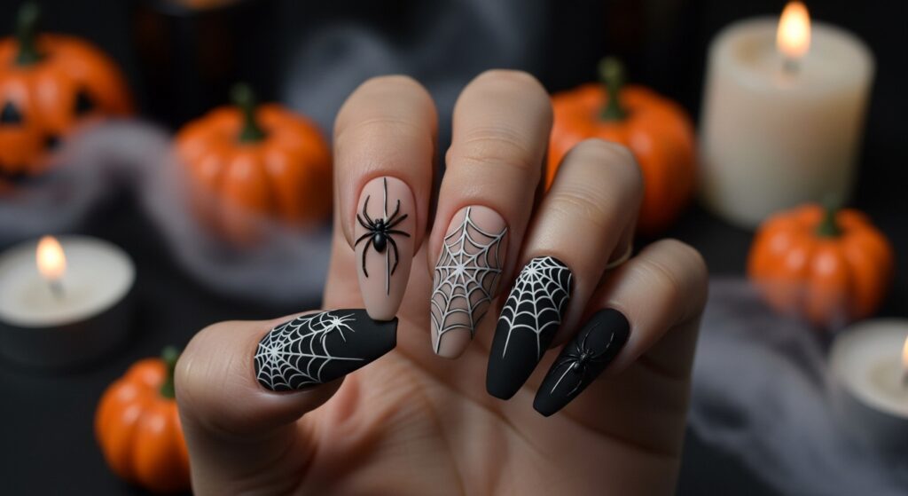 Spiderweb nails remain a Halloween classic, and 2025–2026 brings a more minimal, elegant twist. Using a sheer nude or black matte base with fine white or silver webs, this design looks spooky yet stylish. It’s perfect for short or long nails and pairs well with dark Halloween outfits. Great for anyone who wants festive vibes without going over the top.