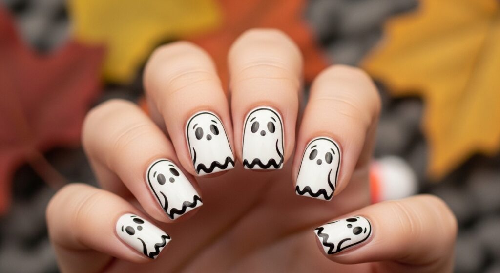 Ghost nails use soft white bases with minimal ghost illustrations for a cute and charming Halloween look. The design is simple yet expressive, perfect for those who prefer sweet rather than scary themes. This trend works beautifully on short nails and complements cozy fall outfits.