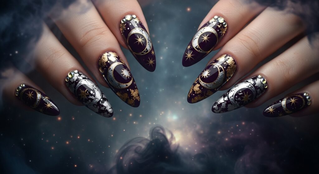 Purple witch nails blend mystic and spooky vibes. Deep purple paired with sparkles, moon shapes, or witch symbols creates a magical look. This trend is ideal for those who prefer mystical Halloween themes over horror.