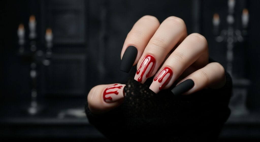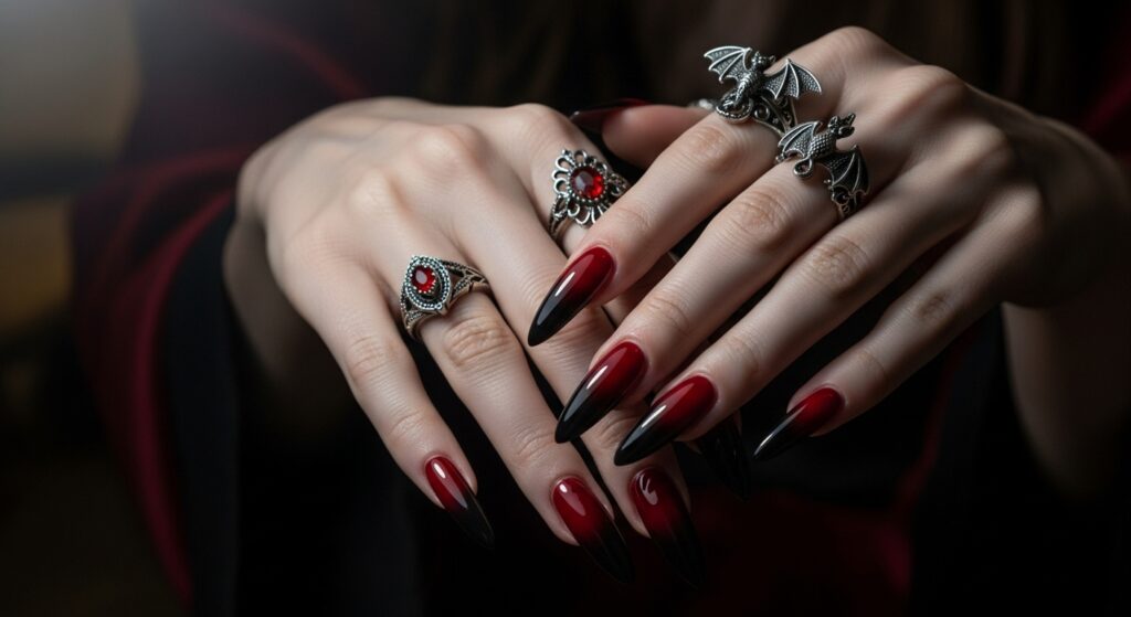 Vampire nails use red-to-black gradients for a dark, seductive Halloween look. The ombre effect feels modern and dramatic, perfect for long almond or stiletto shapes. Ideal for vampire costumes or gothic outfits.
