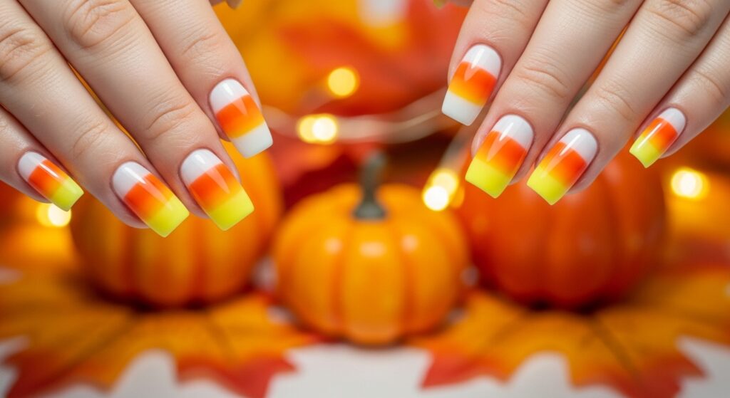 Candy corn nails bring a cute, colorful Halloween twist. The signature yellow, orange, and white gradient is playful and nostalgic. Perfect for those who prefer fun and sweet-themed Halloween nails.