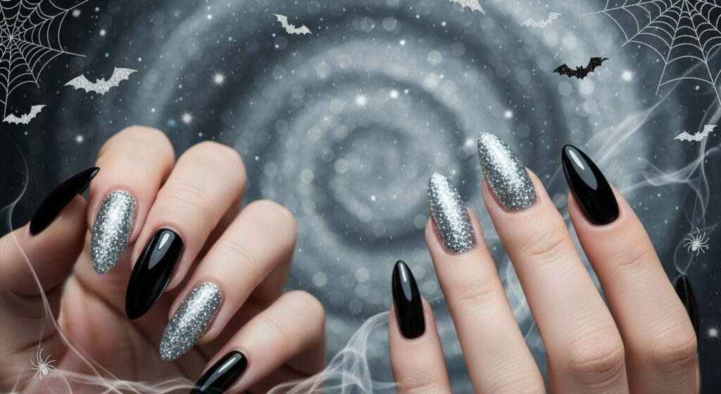Black nails with silver glitter add glam to your Halloween style. The mix of spooky and sparkly makes it ideal for parties or themed events. Simple yet festive, this look works on short and long nails.
