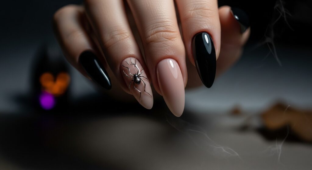 A simple nude or black base with one detailed 3D or painted spider adds instant Halloween drama. It’s minimal but striking, perfect for those who want subtle creepiness. Works best on ring finger accents.