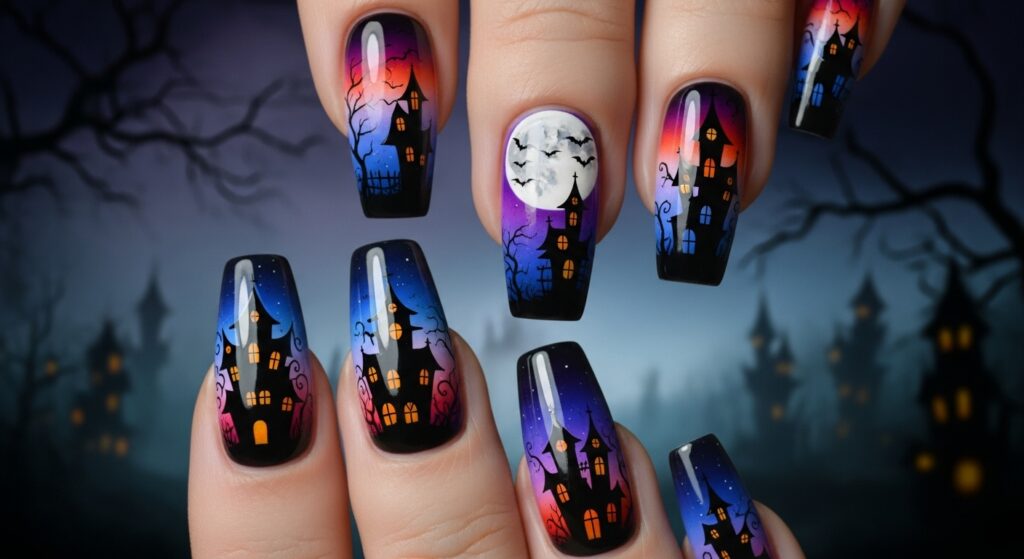 Haunted house nails feature black silhouettes of creepy houses, bats, and trees on a moonlit gradient background. It’s one of the most detailed Halloween looks and suits medium to long nails. Perfect for someone who wants artful, story-like nails.