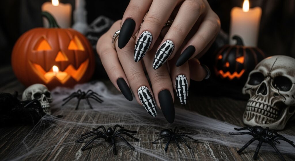 Skeleton hand nails use fine white or silver lines to mimic bones over a black base. The design looks edgy, artistic, and perfect for Halloween events. It’s a trending pick for 2025–2026 due to its bold, realistic effect.