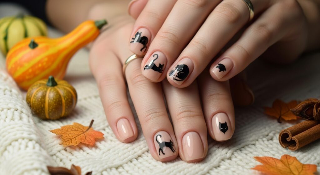 Black cat designs are cute and spooky at the same time. A matte nude or grey base with black cat faces, tails, or paw prints creates an adorable Halloween vibe. Great for cat lovers who want festive nails without scary themes.