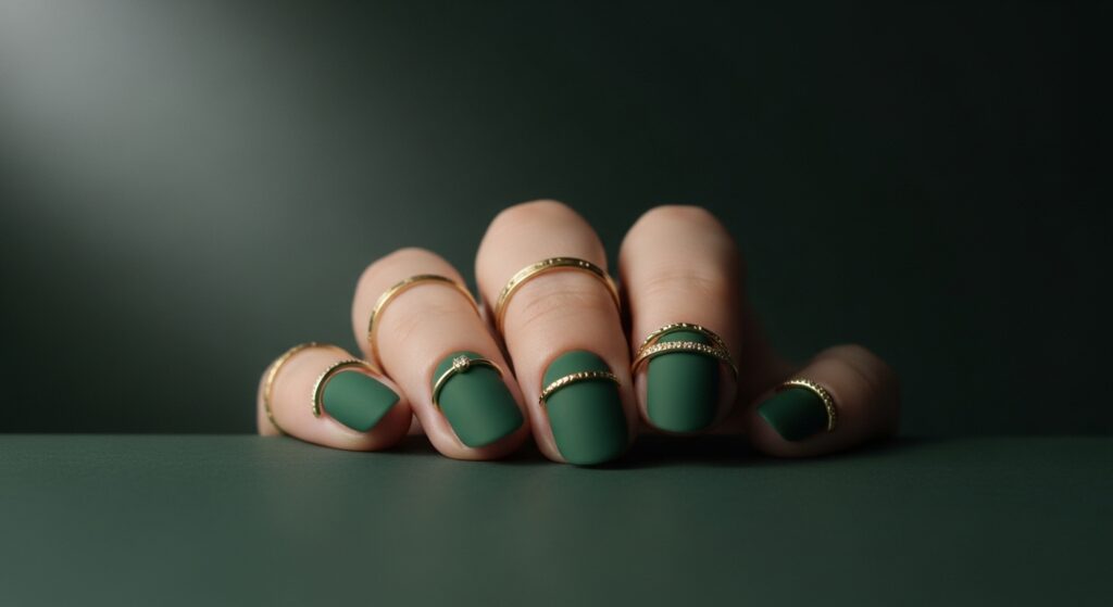 Forest green nails offer a deep and bold look for fall 2025. On round nails, this rich shade appears elegant and sophisticated. It’s perfect for anyone wanting a darker manicure with seasonal flair. Add gold accents for extra depth.