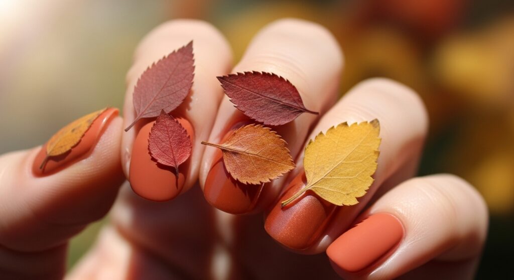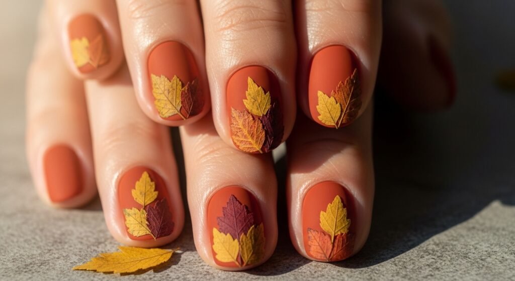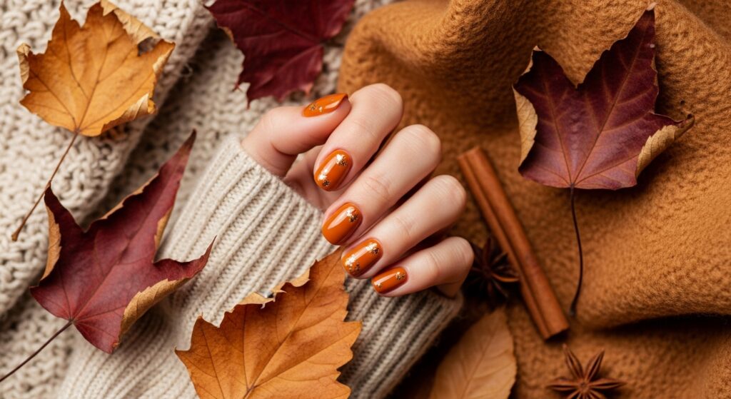 Pumpkin spice nails bring warm autumn energy to your manicure. The rich orange tones look especially cute on round nails, giving a soft and festive vibe. This color works well for both simple looks and subtle gold accents. It’s one of the trendiest choices for fall 2025 and matches perfectly with seasonal outfits.
