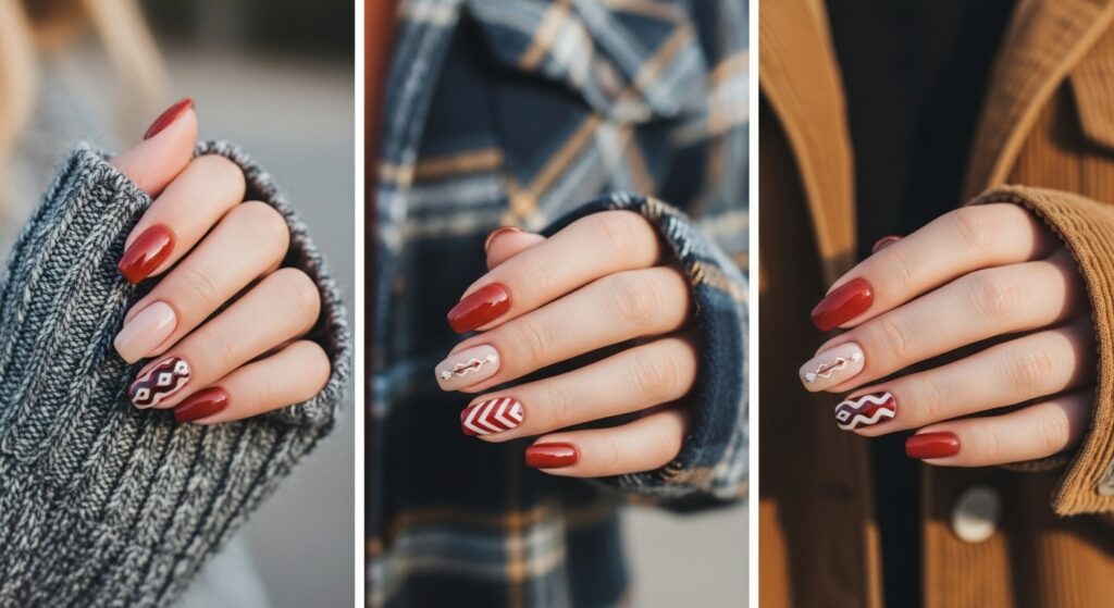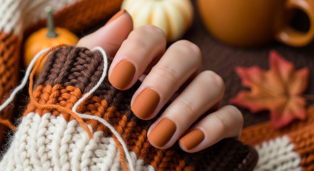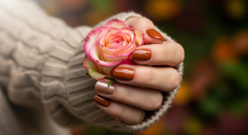 Cinnamon spice nails bring warm brown-red tones that perfectly match fall aesthetics. On round nails, this shade feels trendy yet cozy. It works beautifully with glossy or matte finishes and pairs well with seasonal outfits like sweaters and scarves.