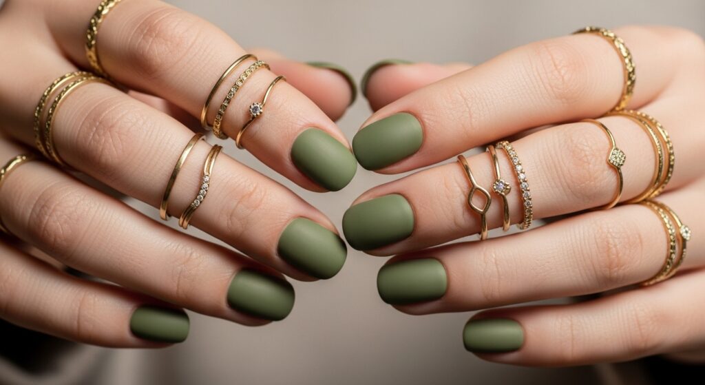Olive green remains a top fall trend for 2025 thanks to its earthy and sophisticated look. On round nails, this muted green appears clean, modern, and minimalistic. It pairs beautifully with gold rings, denim jackets, and neutral outfits. Olive is perfect for everyday wear and minimal nail art styles.