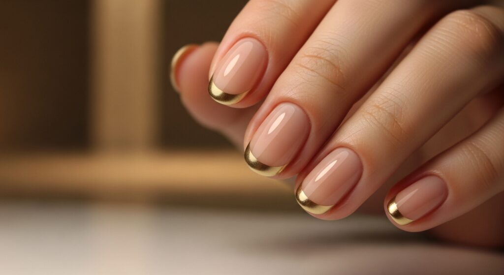 14. Nude Round Nails with Gold Tips