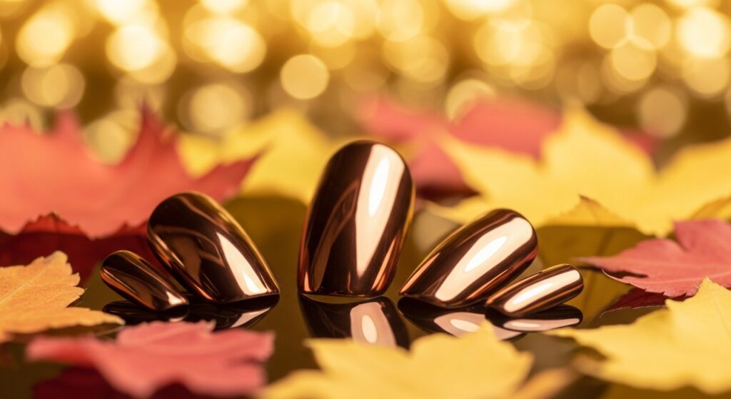 Bronze metallic nails add shimmer and warmth, making them ideal for autumn evenings. The reflective bronze finish stands out beautifully on round nails, offering a glamorous seasonal vibe. This design works well for parties, dinners, or festive fall events.