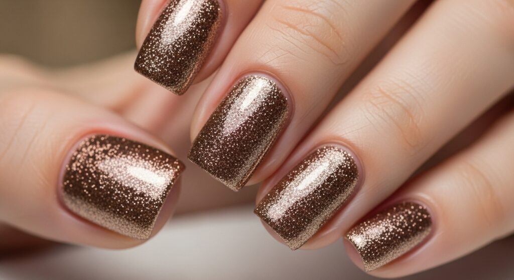 Bronze glitter nails bring festive sparkle to your fall 2025 manicure. Wear them full glitter or pair with nudes for a softer glam finish.